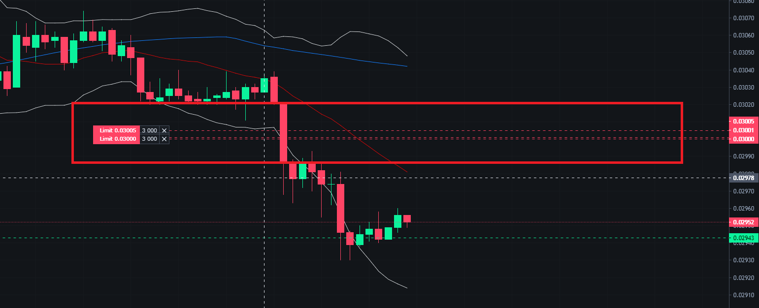 ▲ 1번이던, 2번이던 보유 물량을 나눠서 걸게되면 위와같이 포지션이 종료되는 위치가 나눠서 지정되게 된다. (위 화면은 1만개의 피플을 3천개씩 3개의 가격에 나눠서 걸은 모습이다.)