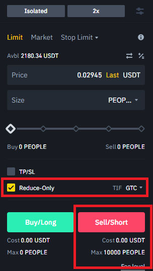 ▲ 그런데 주문창 중간에 리듀스 온리 버튼을 누르면 자신이 현재 진입한 물량을 덜어낼 수 있다. 위에 스크린샷을 찍을때는 롱 포지션으로 피플 1만개를 들고 있었다. 그런데 리듀스 온리 버튼을 누르니 셀 포지션으로 최대 1만개를 걸 수 있다고 나온다. 이 상태에서 원하는 가격을 지정한 뒤 수량을 나눠서 숏 버튼을 누르면 된다.