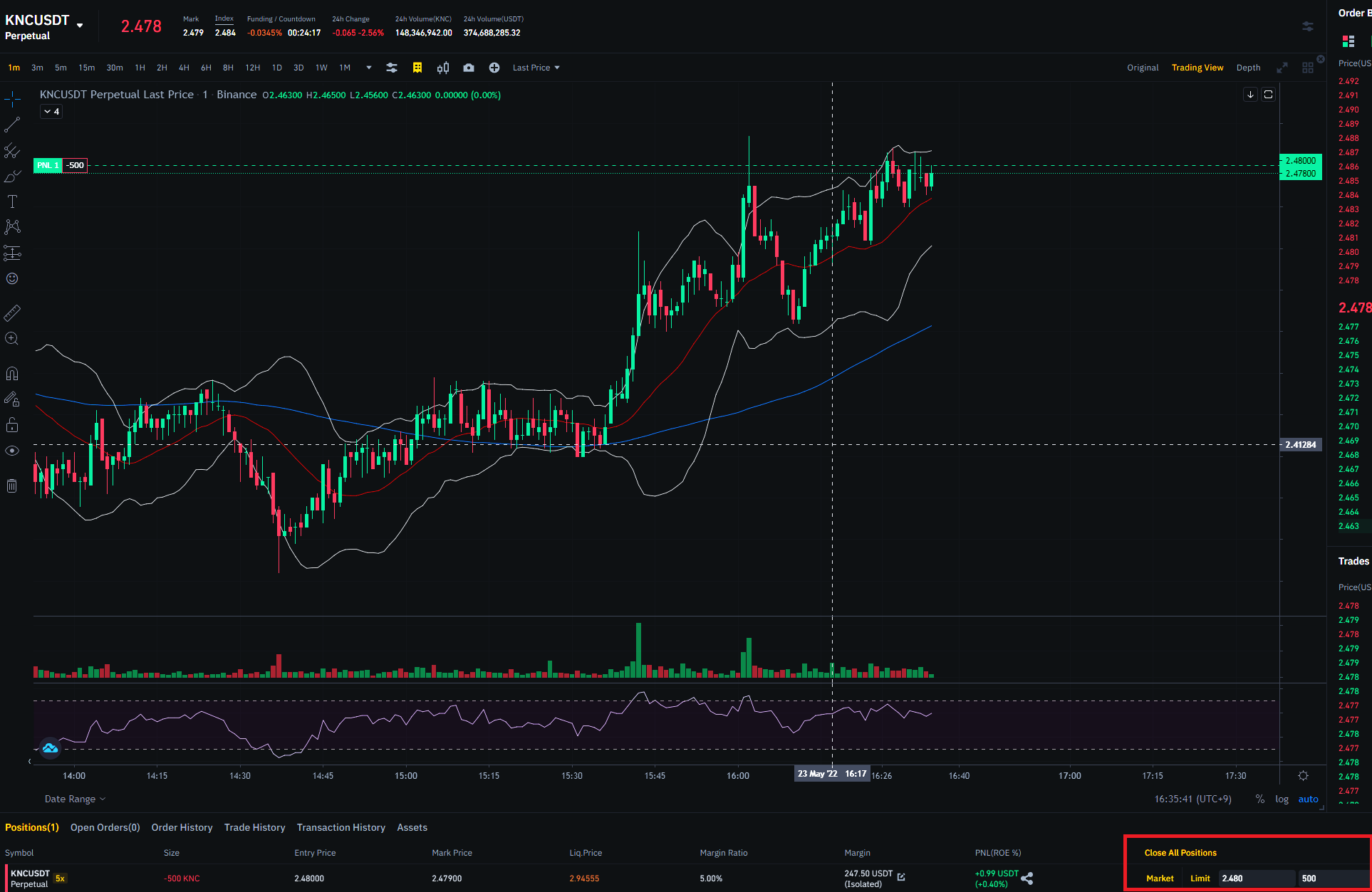 ▲ 어떤 포지션이던 진입하게되면 포지션탭에 보유 정보가 차트 밑으로 뜨게 됩니다. 그 탭에는 코인 이름, 배율, 롱숏(색상으로 구분), 진입 가격, 현재 가격, 수량, 청산 가격, 묶여있는 금액, PNL이 나오는데요. 위 사진과 같이 그 PNL 옆에 노란색으로 CLOSE ALL POSITION 부분이 나옵니다. 여기서 지정가로 매도 포지션을 지정할 수 있습니다.